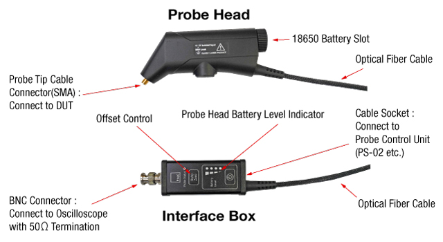 FF-1500 consists of a probe head for measuring signals and a Interface box, with complete isolation between them achieved by a optic fiber cable. The probe head consists of a wideband input amplifier and an EO converter, which are powered by an 18650 battery (take-out rechargeable, sold separately). The Interface box on the signal output side has a BNC connector to accommodate any oscilloscope with a 50Ω input. A probe control unit (PS-02, etc.) is separately required to control the Interface box.