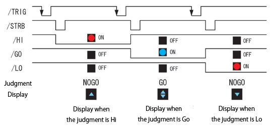After the trigger is entered, the STRB signal indicating the end of measurement becomes “L,” and the threshold selected in the DIO output (YELLOW or RED selection) updates either HI/GO/LO of the output and shorts to GND.
